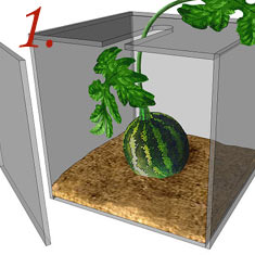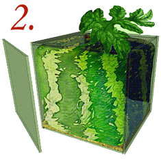 Kao što se vidi na slici 1, dok je lubenica još uvek mala pažljivo je smestite u kockasti kalup, koji na vrhu ima otvor kroz koji prolazi loza lubenice. Veličinu kalupa prilagodite vašim potrebama tj. dimenzijama vaših lubenica. U njega treba da stane lubenica kada poraste i sazri. U početku ona neće dodirivati zidove staklenog kalupa, ali kako bude rasla tako će popunjavati prostor i dobiti oblik kalupa. Donja strana kalupa na kojoj leži lubenica čak i ne mora da bude od stakla, može biti i prazna, pa će lubenica prirodno ležati na zemlji. Sva ostala nega oko bostana obavlja se potpuno uobičajeno.